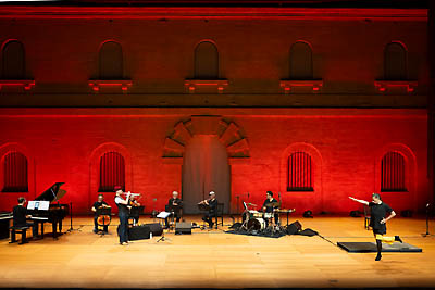 しかし流石にガルヴァンも剛を煮やしたのか、次の曲が始まる直前にメタルを甲高く叩き始めたのだ。流石にこれでは次の演奏に入れない。ここでようやくレオンハートはガルヴァンを見、そこに突き刺さるようにガルヴァンが踊り始めたのだ。こうなったらガルヴァンの勝ち。ようやく二人の即興的コラボが始まった。これは素晴らしかった。これが見たかったのだ! ガルヴァンの食いつきを見事に受け入れ、それを返し、それにガルヴァンが答える。最初からガルヴァンに意識を持っていたドラムが即興で加わり、見事なコラボだった。一方の他の演奏者たちは、唖然と成り行きを見ているだけ。そこに加わることもなく、ここで初めてダンサーがいたのね、という感じで見ているだけ。最後の方になってようやく体がリズムを刻み始めた演奏家がいた程度。彼らはこの公演の趣旨を知らされていなかったのだろうか、あるいは即興演奏をしたことがないのだろうか?譜面ばかり見ていないで、全体を見てよ! と言いたくなった。