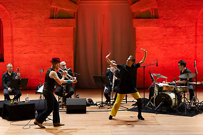 アゴラの屋外劇場が夕闇に包まれ始め、舞台は赤く照らされていた。下手から3分の2はミュージシャンが位置し、上手側にイスラエルが登場する。そしてマイルス・デヴィスのアルバム同様に曲が始まった。ピアノ、チェロ、バイオリン、クラリネット、フルート、ドラム6人をトランペットを吹きながら指揮するレオンハート。そこにガルヴァンがカスタネットなどで参加しようとするのだが、演奏者は譜面とレオンハートの指揮を見るばかりで、ガルヴァンの存在など全く意識していない感。音楽は7人で完全に出来上がっているから、ガルヴァンが介入しても雑音としか聞こえない。サパテアードを踏んでも、パルマやカスタネットを叩いても、全く曲に入る余地がないのだ。なんとか中に入ろうとするも、一部の隙も見つけられず、上手の袖の階段を上り下りしてみたりして、地味に参加している。そのうち椅子に座って曲を聴いていた。コンファレンスでは、スペイン語しか話さないガルヴァンと、英語しか話さないニューヨーカーのレオンハートがどのように作品を詰めたのかという質問に、言葉はわからなくても、音楽とダンスで会話したと豪語していたのだが、いったい彼らはリハーサルをしたのだろうかと疑いたくなってしまう。唯一ドラム奏者がガルヴァンの動きを意識している以外は、誰もガルヴァンの存在さえ意識せず、コラボレーターのレオンハートもガルヴァンを見ることもなく、楽団の方を見て客席には背中を向けていたのに、コンサートのように一曲が終わればくるりと客席を向いてお辞儀をする。あら?これはコンサートだったのかしら? ダンスじゃなかったの?
