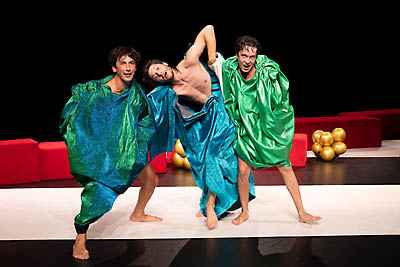 会場に入れば男3人が真っ赤な長椅子に寄りかかって座っている。 からだ半分が黒と白のレオタード姿という衣装に、どんなことが始まるのかと期待していたのだが、何も始まらない。だから観客はお友達とおしゃべりを始めたりしている。長すぎる、何も始まらない、と思いきや、あら? 3人の表情が少しずつ変わっているではないか。会場を見回しながら目を細めたり、見開いたり、微笑んだり、ぼーっとしたり。そしてずるずるっと動き始めた。隣の人に寄りかかったり、長椅子にのそのそとよじ登ったり、ずるずると動きながらも、時折ピシッとポーズが決まったりして、ただずるずるしているわけではないようだ。このずるずるのコンタクトをしているうちに、一人が台の後ろに消えて、しばらくして現れたらなんとゴールドのボールが5つくらい付いた顔になっていた。重ねた台を一気に崩すシーンは、ピナ・バウシュのパレルモパレルモを連想したが、規模が小さいので可愛らしい。そして最後は3人ともボールをくっつけた顔で登場して、震えたり、歩き回ったり、くっついたり離れたり。だから何? なのだけれど、ヴァンパクらしい。