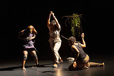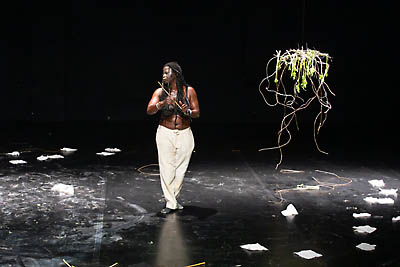 プログラムに書いてあった彼女の言葉によると、コートジボワールの、今では消滅した自分が育った村への旅がこの作品のベースになっているという。雑草が生い茂る森の中で消滅した生家を探すということは、さぞかしむなしさや悲しみを訴えるのかと思ったら、明るい。歌手二人のリズミカルでハリのある元気な声のせいだろうか。
