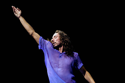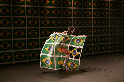 ホリゾントいっぱいにブラジルの国旗。その前でシルエットとして浮かび上がる男が、クネクネと体をくねらし踊っている。ズーンズズン、ゆったりとしたリズムとそれをつき破るかのような叫び声の中、高いヒールのブーツを履いた男はしなやかに、そしてセクシーに腰や腕を動かしている。舞台の前面に出て立ち止まった時、突然照明がついた。彼は全裸で正面を見据えて立っている。ただじっと立っている。すると胸や腹の筋肉を動かし始めた。後ろ向きになって肩甲骨を動かす。尻を細やかに早く揺らす。顔の表情を変える。激しく動いているわけではないのに、汗で体が光っている。体のあらゆる部分の筋肉が動いている。体の芯から動きが出ているのだ。