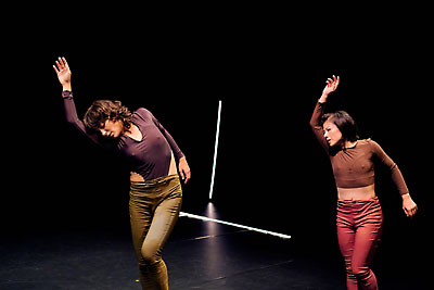 前半は女性のデュエットで、バッハのゴルトベルグ変奏曲に乗って、ゆっくりとしたステップを踏みながら体を捩らせる動きがメインだ。付かず離れずの二人は、時折同じ振りをしたり呼応しながらも、それぞれの世界観を持ち続けている。