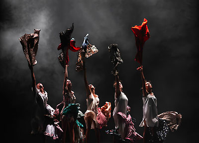 5人の女性がじっと佇む。涙を拭いたり、ひたいの汗を拭ったりするような動作がゆっくりと繰り返される。悲しみを携えた女たち。その動きが次第に激しくなるとともに、呼吸音と倒れる音がリズムを作る。倒れては起き上がり、また倒れては起き上がり、今度は着ていた服を脱ぎ捨てて床に叩きつけ、怒りをぶつけながら床を擦るような動作。 タイトルのMaldonneは、「トランプの配り違い」とか、「誤解」「間違い」という本来の意味と「マドンナ」を合わせたイメージでつけたということから、女性を蔑視する社会を批判したものだろう。ちょっと古めかしい服が、こき使われる家政婦を連想して重いなあと思い始めたのだが、「私は惨め〜、私は悲しい〜」などという歌詞に合わせて口パクで歌い始めたあたりから、あら? ヒステリックに怒りをぶちまけ、八つ当たりに取っ組み合いの喧嘩が漫画チックに描かれた場面には、これはパロディだったのか? と吹き出してしまった。臨月の妊婦の腹から出てきたのは大量の布。これを投げ合い、いがみ合うなり助け合うなり忙しい。そして最後は重ね着していた服を脱ぎ捨てながら床に叩きつけて、でもそれは女性の勝利を仄めかす。見事な展開だった。
