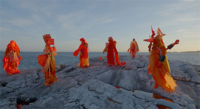 身体中をオレンジ色の服やオブジェを纏った人たちが、崖や海に突き出す岩肌の上でかなり強い風に吹かれながら立っている。海や空の青と岩肌の茶色、そこにくっきりと映えるオレンジ色が美しい。一方の隣の映像は森の中。しっとりとした緑一色の中に黒いものがゆっくりと動いている。黒い陰が木々の間から現れ、そして静かに消えていく。森の精霊だろうか。