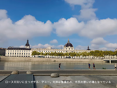 ローヌ川沿いに立つオテル・デュー。この広大な建物は、病院、そしてホスピスとして機能していたが、2019年に大改造され、高級ホテルやショップ、レストランが入り、中庭も整備されて市民の憩いの場となっている。