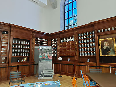 たくさんの薬の陶器の入れ物が、昔は病院だったことを窺わせる